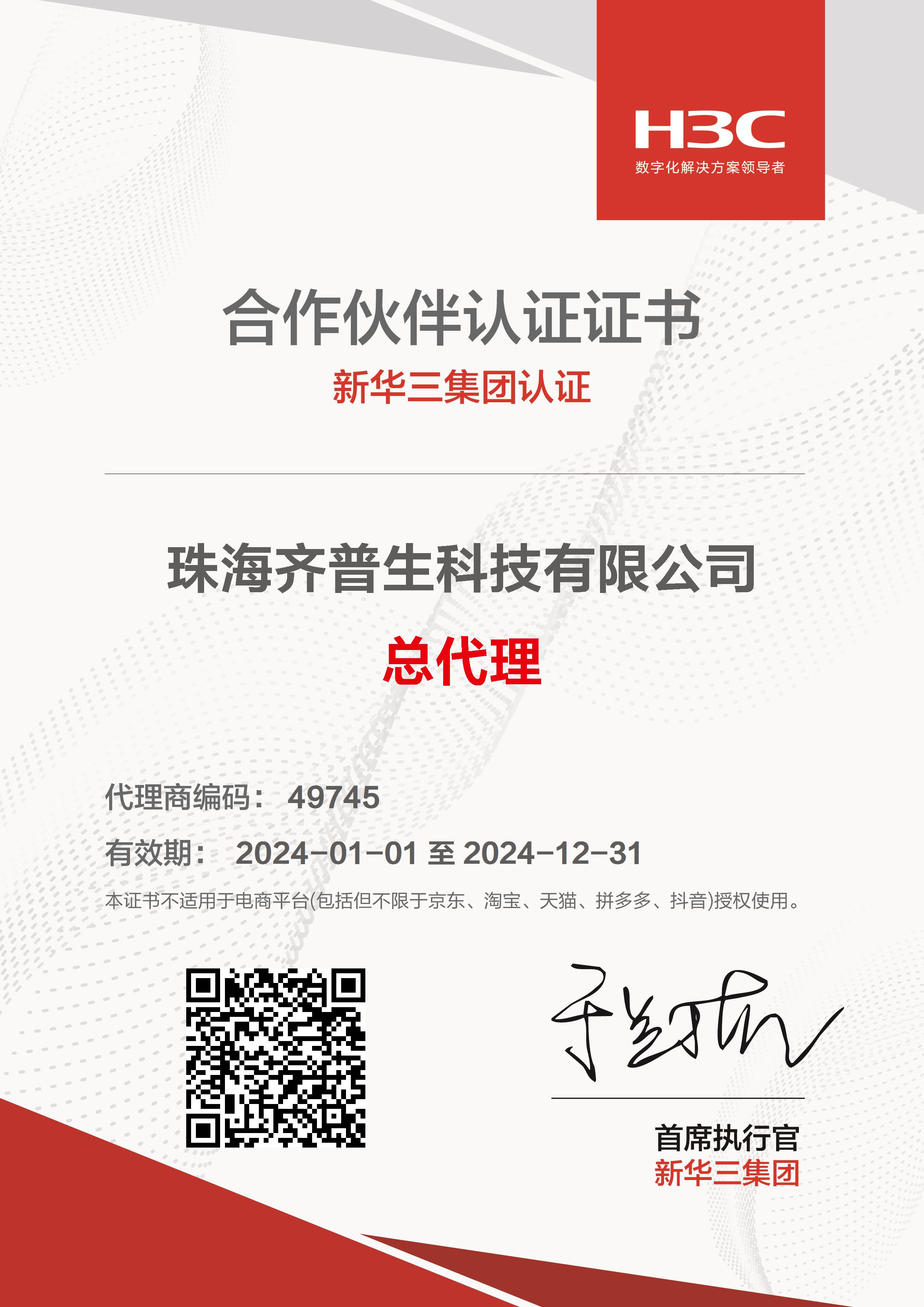 H3C總代證書(shū)(珠海公司)